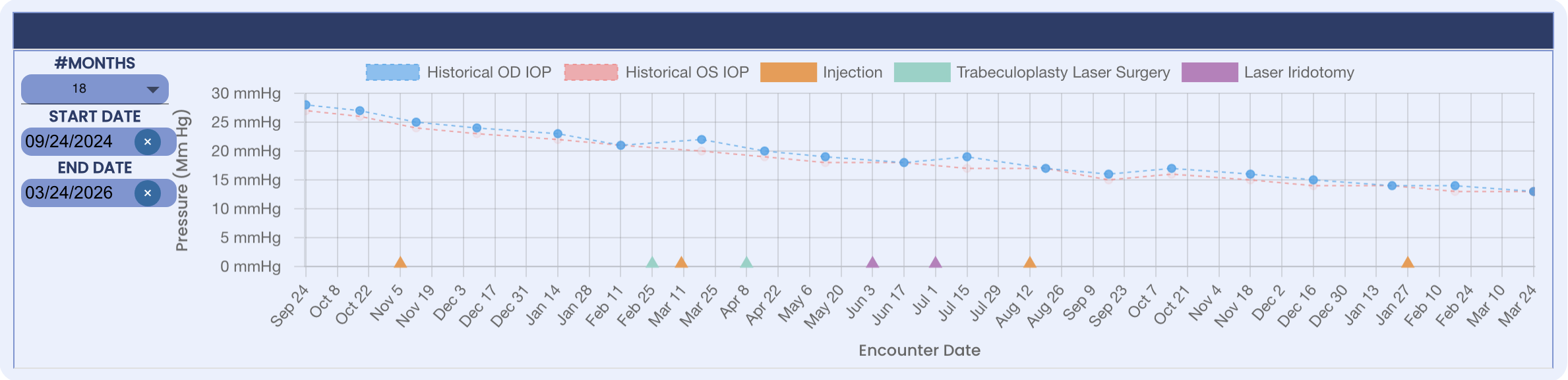 Track IOP, visual acuity, and other key metrics across visits — overlayed with procedures and treatments so you can correlate interventions with outcomes at a glance.