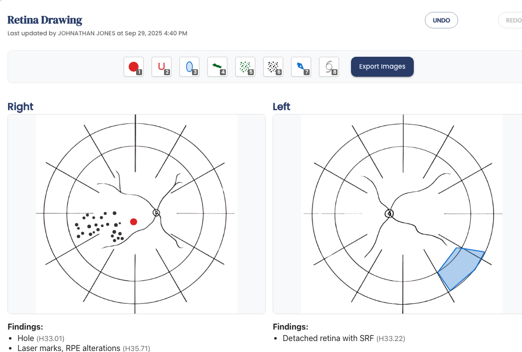 Every field, workflow, and template designed for the ophthalmic exam — IOP tracking, gonioscopy, retina drawings, injection series, and more.